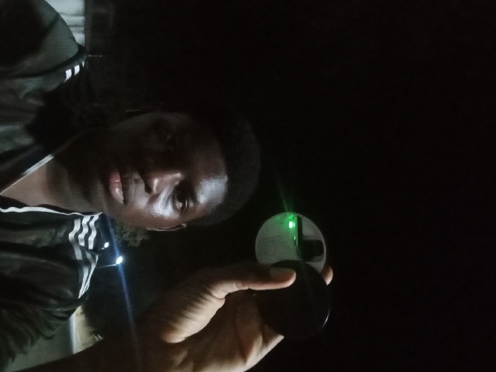 A person with dark skin and short, dark hair wearing a black shirt with white stripes is holding a round, white object with a green light in their left hand. The person is gazing at the camera. The background is dark and blurry. The object appears to be an electronic device, possibly earbuds in a case, with a visible power indicator. The lighting in the scene seems to be artificial, highlighting the subject's face and the device.