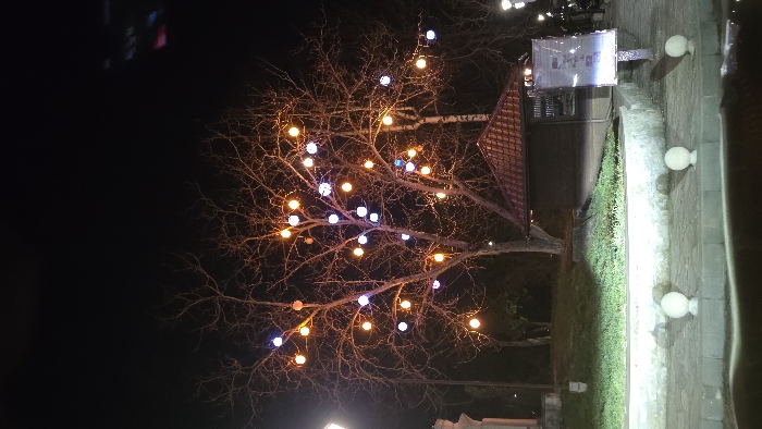 The image displays a nighttime outdoor scene in Arbanassi, Bulgaria. In the foreground, a paved area is visible, edged by a low, light-colored concrete barrier. Three spherical, white bollards are evenly spaced along this barrier, casting distinct shadows to their right. Behind the barrier, a raised section of vibrant green grass is present, illuminated by a strong light source originating from the viewer's position. The mid-ground is dominated by a large, bare deciduous tree, its branches extensively adorned with numerous spherical lights in alternating warm amber/orange and cool white/blue colors. To the right of this main tree, a second deciduous tree with lighter bark is partially visible. Further right, a small, dark-colored structure with a reddish-brown tiled, gabled roof stands. Adjacent to this structure on its right is a vertically oriented, illuminated information sign, displaying unreadable text and graphics. A streetlight pole with a light fixture is partially visible on the far left edge of the frame. The sky above is dark and featureless. The background beyond the illuminated areas consists of dark, unidentifiable trees and shadows. No individuals are present in the scene, and no discernible actions or interactions are occurring.