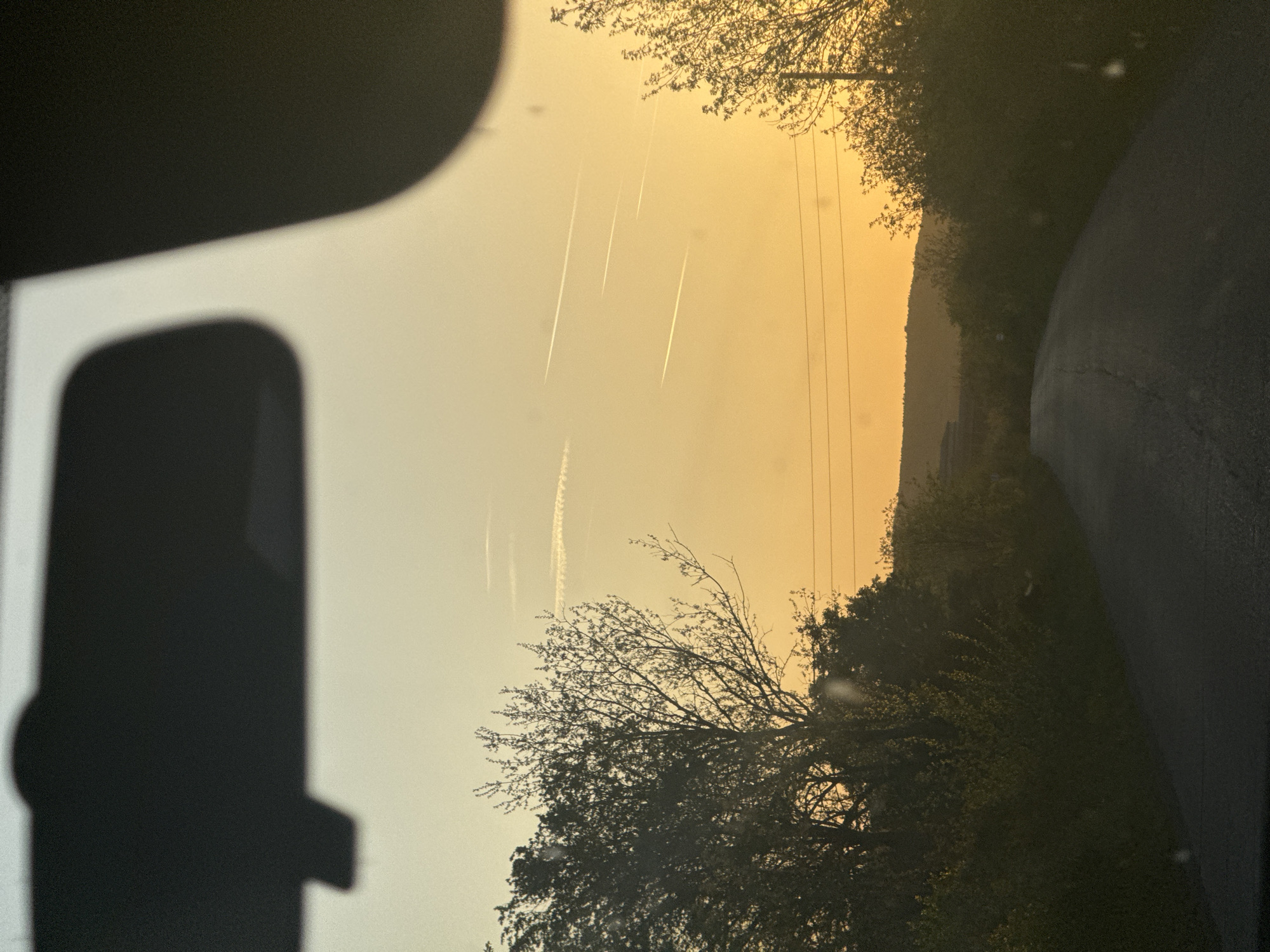 The photograph, taken from inside a vehicle, presents a view of a landscape under an orange-tinted sky. In the sky, several contrails from aircraft are visible. Power lines stretch across the upper portion of the frame. The foreground features the silhouette of the vehicle's interior, while the middle ground is occupied by trees and vegetation. To the right, a road is seen. The horizon reveals a low hill or mountain range. There is no indication this image is in Gromshin, Bulgaria.