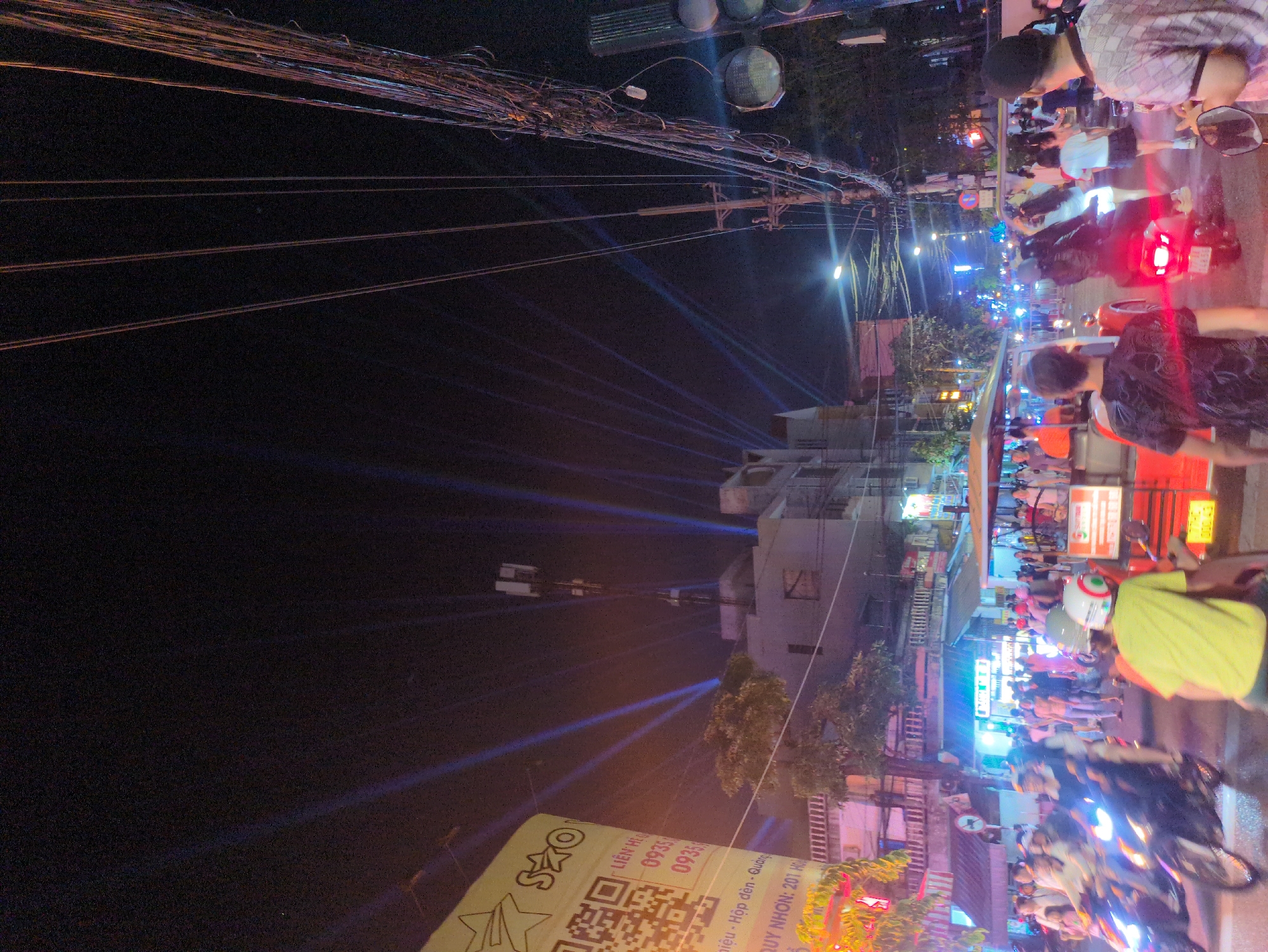 The image presents a nighttime urban street scene in South Quy Nhon Ward, Vietnam. The dark sky is punctuated by multiple ascending blue laser light beams originating from an unseen ground source, illuminating the upper facades of surrounding buildings. A dense, tangled mass of overhead utility wires stretches across the upper and right portions of the frame, supported by a utility pole. Buildings line both sides of the street; on the left, a large yellow cylindrical sign features a QR code, the text "SAO," and "LIEN HIỆP - QUY NHON: 201 Ho..." with associated phone numbers. A multi-story building in the mid-ground prominently displays a cellular antenna structure on its roof. The street below is actively populated by vehicles and pedestrians. Numerous motorbikes, some with riders wearing helmets, are in motion, evidenced by light trails and motion blur, displaying illuminated headlights and red taillights. A distinctive red three-wheeled vehicle occupies the central-right portion of the roadway, with individuals visible inside. Pedestrians are observed walking along the street and sidewalks. The scene is illuminated by a combination of streetlights, vehicle lights, and commercial lights from buildings, contributing to a vibrant, bustling atmosphere.