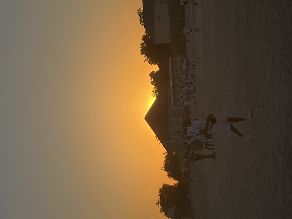 The sun sets behind a building with a triangular roof, casting an orange glow. Silhouetted figures, seemingly children in white uniforms, stand in a line. Two figures are in the foreground, engaging in some action. Trees line the edge of the field, partially obscuring a building in the background. The sky blends from orange near the sunset to a muted grey higher up. The ground is a muted dark color.