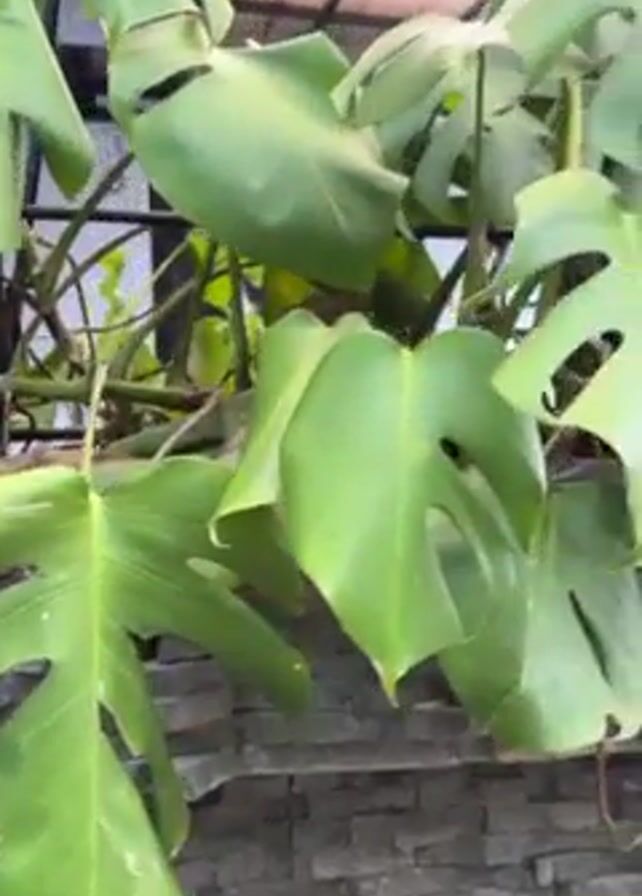 Monstera plant growing against a gray brick wall. The camera pans up to show the leaves of the plant, which are large and green with distinctive holes. The plant is growing indoors, under a translucent roof. The background is slightly blurred. There is no audio.
