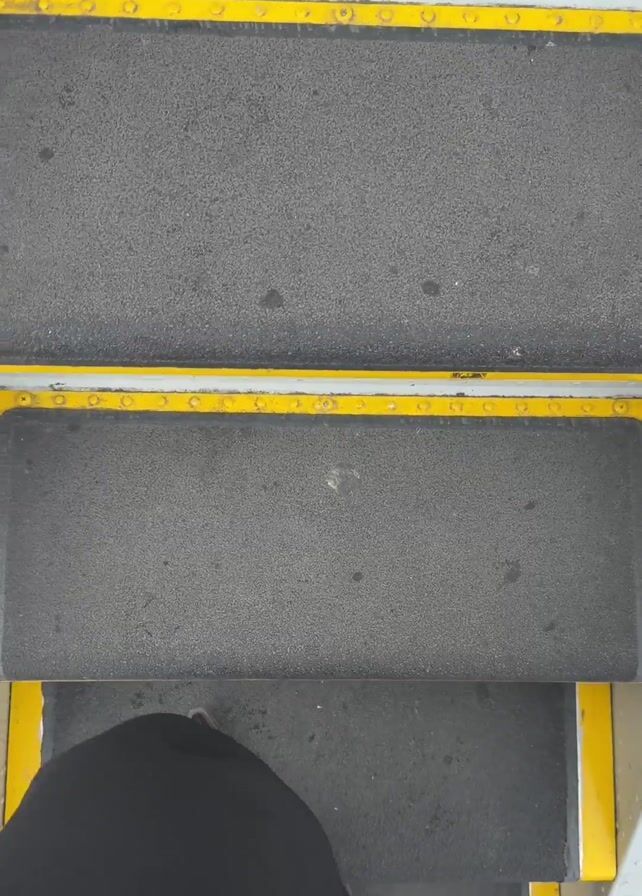 A person in black pants and black shoes is walking down a short set of steps. The steps have gray treads with a yellow border. The camera is positioned above the person, providing a downward view of their feet and the steps.