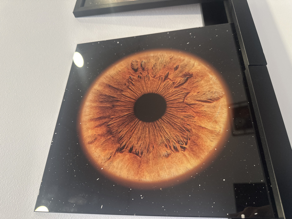 The scene, located in Plovdiv, Bulgaria, displays a square, glossy art print mounted on a reflective surface, resting on a matte black display shelf against a plain white wall. The print centrally features a highly magnified human iris, predominantly orange-brown with detailed radial striations and a dark central pupil, encircled by a soft orange glow. This iris is set against a dark background speckled with white points, resembling a starry sky. Visible reflections include a bright, elongated light source in the upper right quadrant of the print, a smaller crescent-shaped reflection in the upper left, and a faint rectangular reflection of a dark object below the iris. A portion of a second artwork, framed in black, is visible on the shelf to the right of the main print. A subtle reflection of a hand holding a photographic device is discernible in the lower-left corner of the primary artwork.