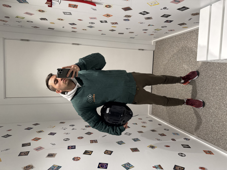A male individual is depicted in an indoor hallway, facing a reflective surface to capture a self-portrait with a dark-colored smartphone held in his right hand. He is dressed in a light grey hooded sweatshirt layered under a dark green quilted bomber jacket, dark olive-colored jogger pants, and burgundy athletic shoes. A glossy black helmet is held securely in his left arm, resting against his side. The white walls of the narrow hallway are extensively decorated with numerous small, multi-colored square and rectangular stickers or printed cards, arranged randomly. A closed white door is visible directly behind the subject. The floor is covered with a light grey, speckled carpet. A white, multi-tiered slatted object is partially visible in the bottom right foreground. No visual information within the image provides specific identification of the location as Bodrum, Turkey.