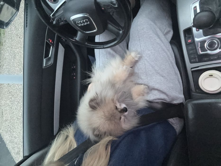 interior of a car, with a person wearing grey sweatpants and a dark blue lap area. A fluffy, light-colored Pomeranian dog lies on the person's lap, with its head near the seat belt. The car features an Audi steering wheel and a center console with various controls, including a cup holder with a closed white lid. The car door is visible on the left.