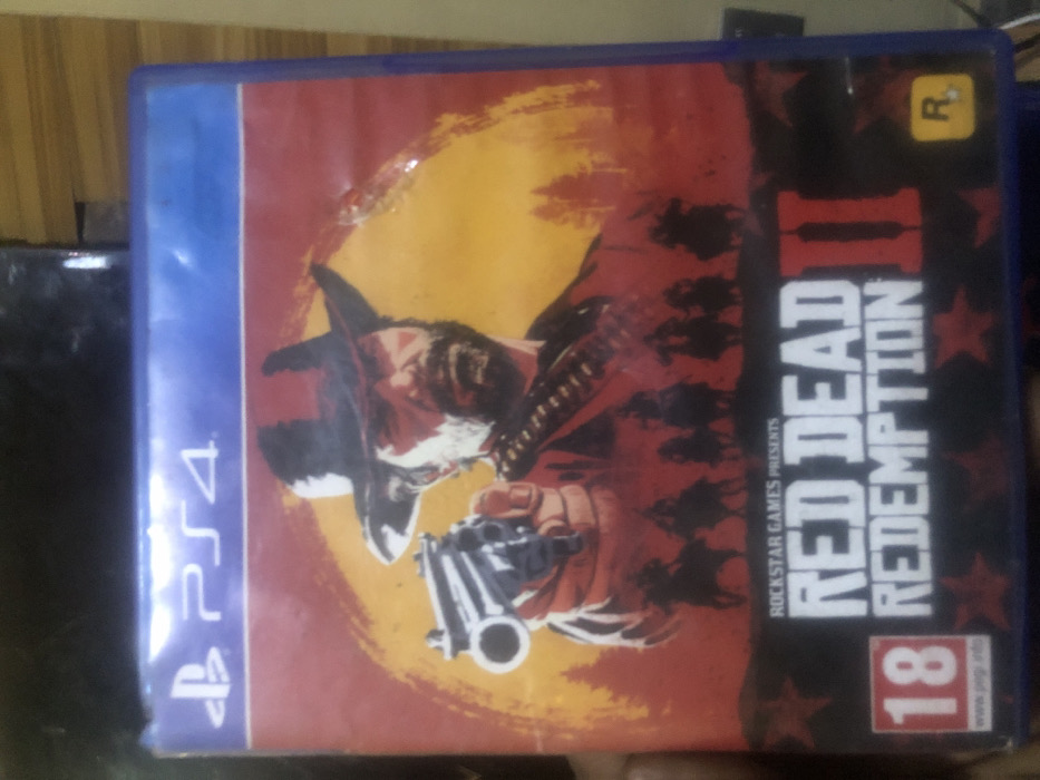 The image displays a PlayStation 4 game case for "Red Dead Redemption II." The front cover art features a rugged male character, possibly Arthur Morgan, wearing a cowboy hat and a bandolier, pointing a silver-barreled revolver directly forward. His expression is serious, and he has a beard. Behind him, a vibrant orange and red background suggests a sunset or sunrise over a landscape with silhouetted trees. Below the central figure, a line of six silhouetted horsemen ride across a dark foreground. Textual elements on the case include "PS4" in the upper left corner, "ROCKSTAR GAMES PRESENTS" above the title, and "RED DEAD REDEMPTION II" prominently displayed in the lower central area. To the bottom left, a PEGI 18 age rating symbol is visible, with "www.pegi.info" underneath. A small "R" rating symbol is present in the lower right corner. The game case is held slightly at an angle, with a portion of a hand visible along the left edge, indicating it is being physically held. The case itself shows minor surface wear, including faint scratches and a slight crease or indentation on the top right area of the cover art. The background is blurred, suggesting an indoor setting with muted colors, possibly a wooden surface or a dark object to the right and top. There are no visual cues within the image to specify a location in the city of Jos, Nigeria.
