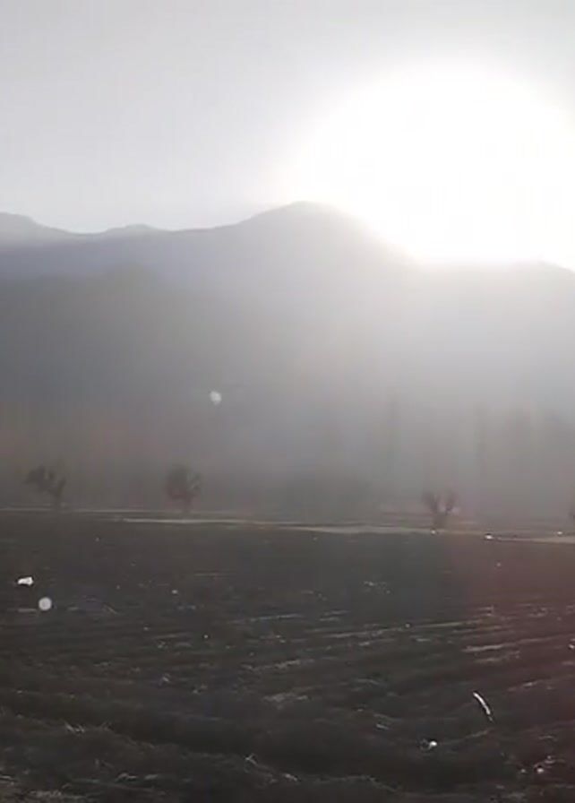 hazy landscape at dawn or dusk. The sun is shining brightly behind a range of mountains. In the foreground is a field of tilled soil. There are a few trees scattered across the field. In the distance, there is a row of tall trees. The sky is a pale blue. A few dark branches are visible in the bottom left corner. A man’s voice can be heard.