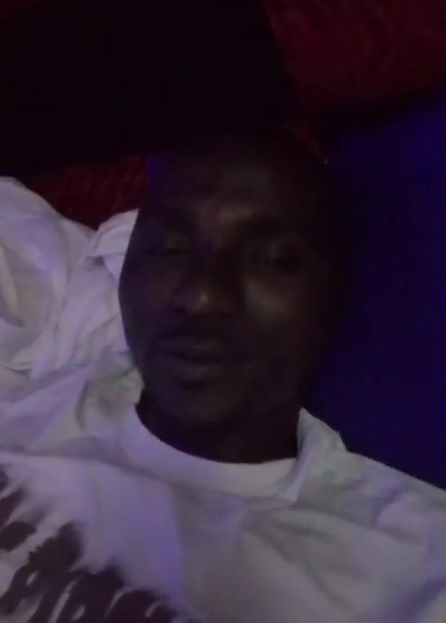 person lying down and looking into the camera. They are wearing a white t-shirt with a design on it. The person is in a dimly lit room with what appears to be a red patterned surface behind them. There is also a white pillow and a blue surface visible. The camera remains stationary throughout the video.