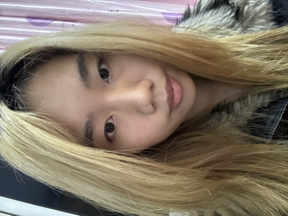 A portrait photograph depicts a young East Asian female in an indoor setting within the city of Guandu, China. She is positioned centrally, looking directly at the viewer with a neutral facial expression. Her hair is long, blonde-dyed with dark roots visible, and frames her face. She wears a black jacket featuring a grey and brown fur-trimmed collar, with a zipper partially visible on the jacket's front. The background on the left consists of a dark, indeterminate vertical object, while the right side displays light pink vertical blinds or curtains with a subtle pattern. The precise location within Guandu is not discernible from the visual information.