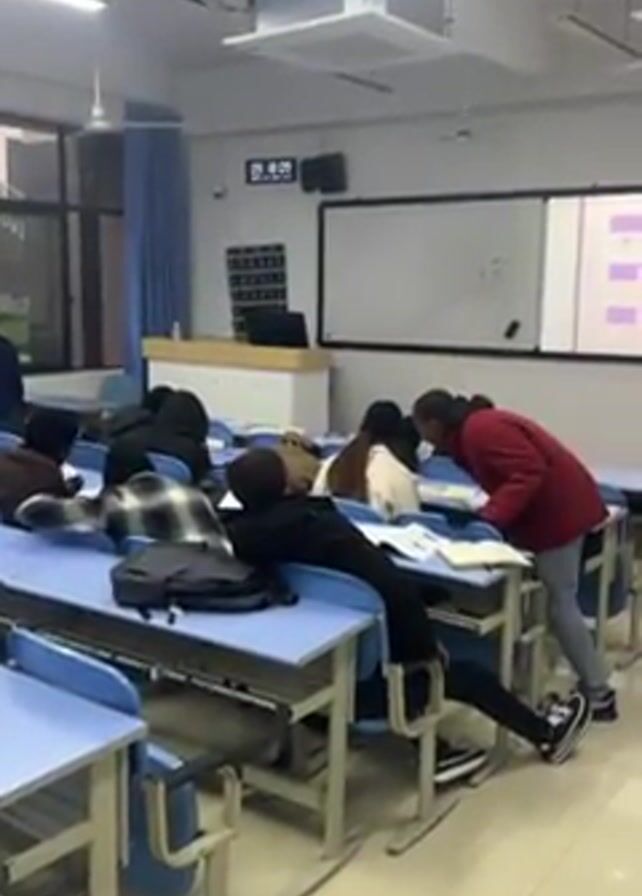 classroom with approximately 10 students. Most of them are lying face down on their desks, seemingly asleep. A man in a red jacket is standing near the front row of desks, talking to one of the students. The desks are arranged in rows. There is a whiteboard at the front of the classroom with some writing on it, and a digital clock displays the time as 09:18:12. The classroom is brightly lit with what appear to be fluorescent lights. There is a window on the left side of the frame.