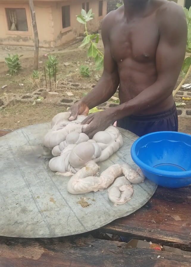 Certainly, let's analyze the video clip. **Scene:** The video appears to be shot outdoors, likely in a yard or garden area, adjacent to a single-story building with a grey roof. **People:** A shirtless, dark-skinned man is the focal point. He is handling a pile of what appears to be animal intestines. Another person may be recording the video. **Objects:** Key objects include: * A round, light-grey, wooden cutting board. * A pile of animal intestines that have a fleshy and globular appearance. * A bright blue plastic bowl. * A wooden table. * A curved blade (possibly a machete or large knife). * Bowls. * A jerry can. **Actions & Interactions:** The man is shown manipulating and handling the animal intestines on the cutting board. He appears to be in the process of cleaning or preparing them. **Environment:** The surrounding environment is somewhat cluttered, including green vegetation.
