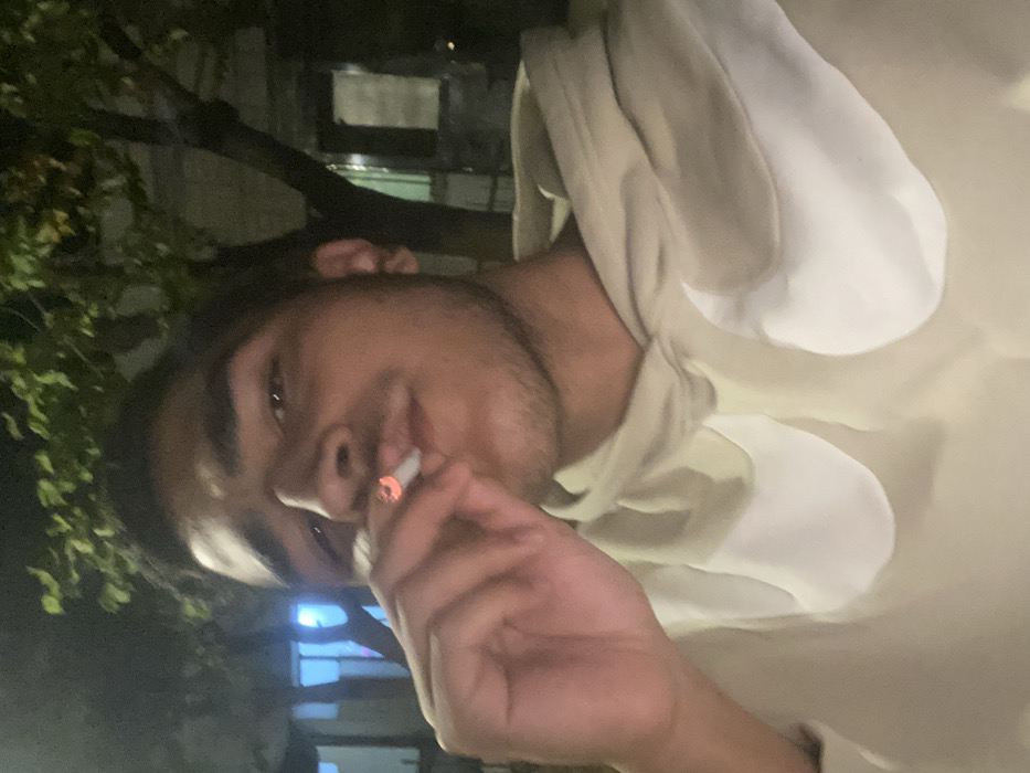 The scene takes place outdoors at night in the city of Talfita, Syria. A young adult male is depicted from the chest up, positioned slightly off-center and looking directly towards the camera. He holds a lit cigarette to his mouth with his right hand, the tip glowing orange. He wears a light beige hooded sweatshirt featuring a large, partially visible white Nike "swoosh" logo across the chest. His hair is dark and styled back, and he has light facial hair. The background is dimly lit and blurred, revealing green foliage from a tree in the upper right and what appears to be a building or structure with indistinct lighting, possibly from windows, in the distance. Blue and white artificial light sources are visible in the upper left background.