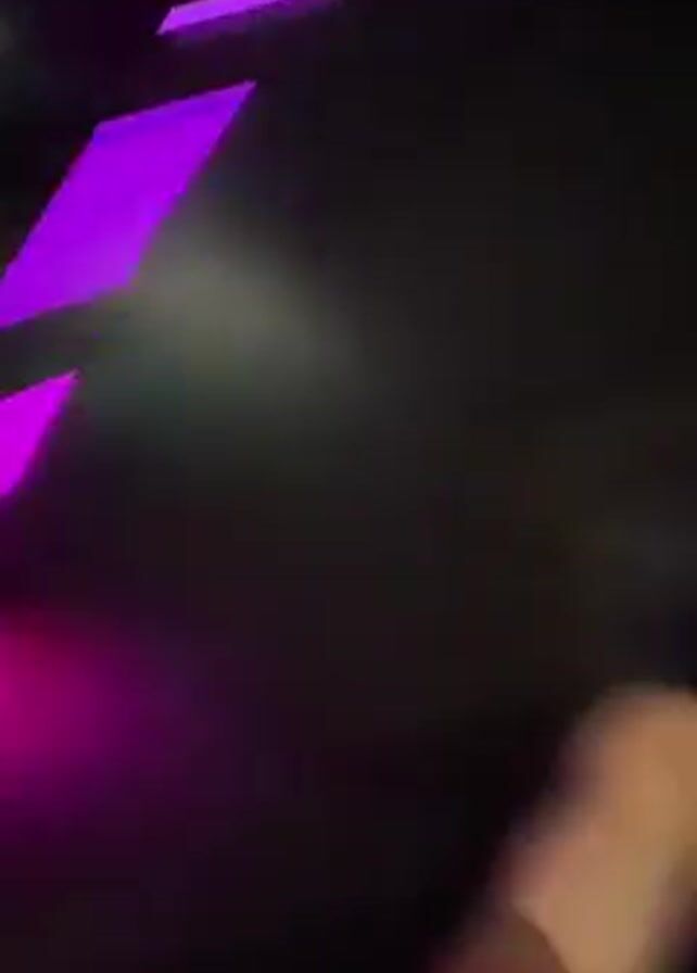 A woman is recording a video of herself in a gym. She is lying on her back on a gray mat, wearing black leggings and a black sports bra. The gym has black walls, purple lighting, and a mirror. A water bottle lies nearby on the floor. The camera rotates from a view of her midriff to her face and back again.
