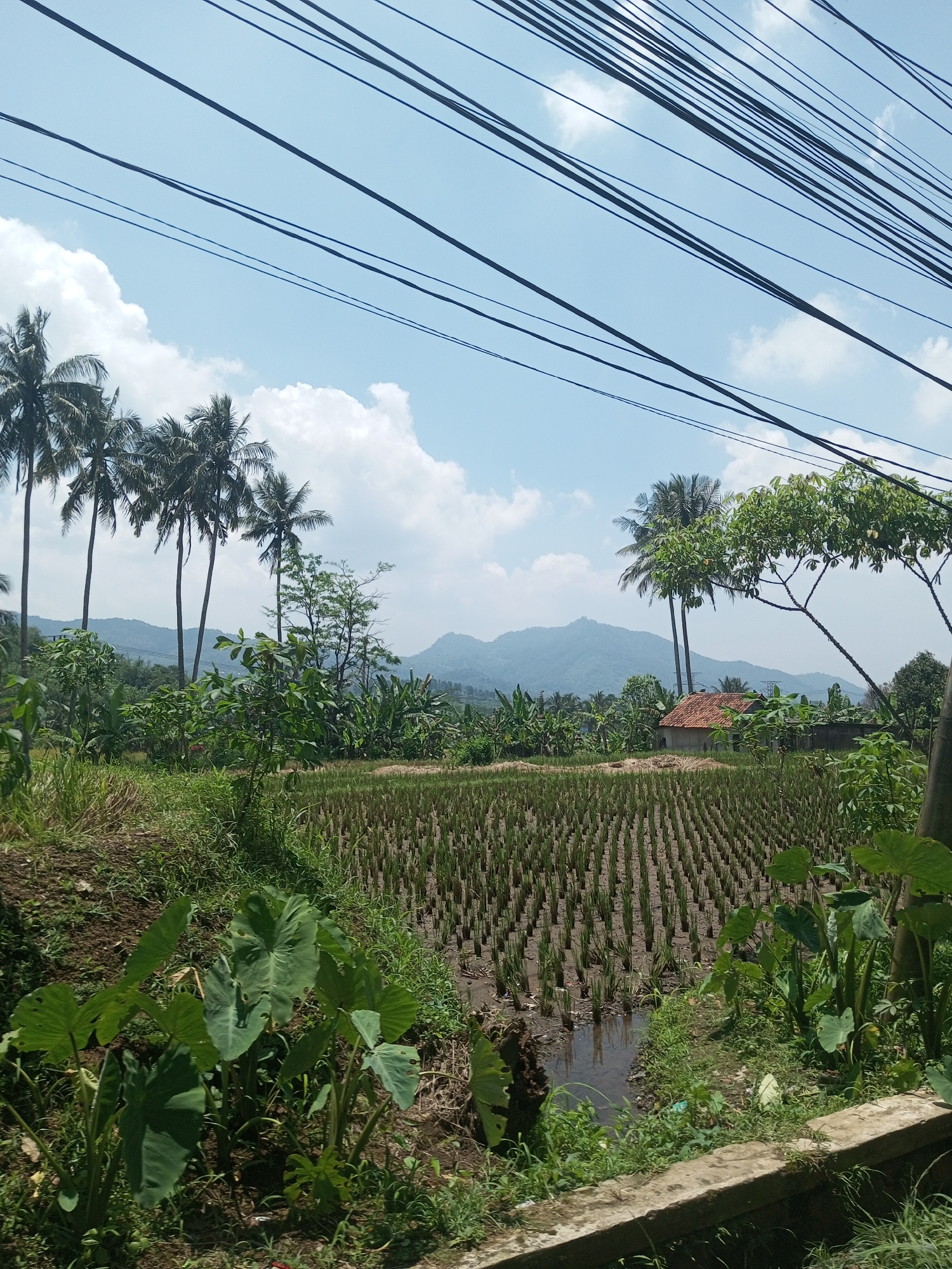 The image depicts a rural landscape, potentially in Nawng Hkar, Myanmar. A rice paddy field, with rows of rice stalks, dominates the midground, with a small stream flowing through it. Lush green vegetation and large-leafed plants frame the foreground. In the background, there are trees and a small building with a red tile roof. Distant hills are visible under a partly cloudy sky. Power lines are strung across the top portion of the image. No people are visible.