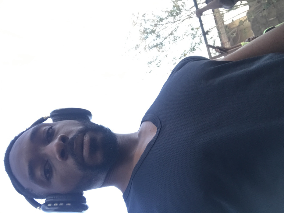 A person with dark skin and a beard is wearing headphones. They are positioned in the lower left of the frame, looking directly at the viewer. The person is wearing a dark-colored shirt. The background is blurred and includes the sky and some trees. Another person is visible in the background in the upper right corner.