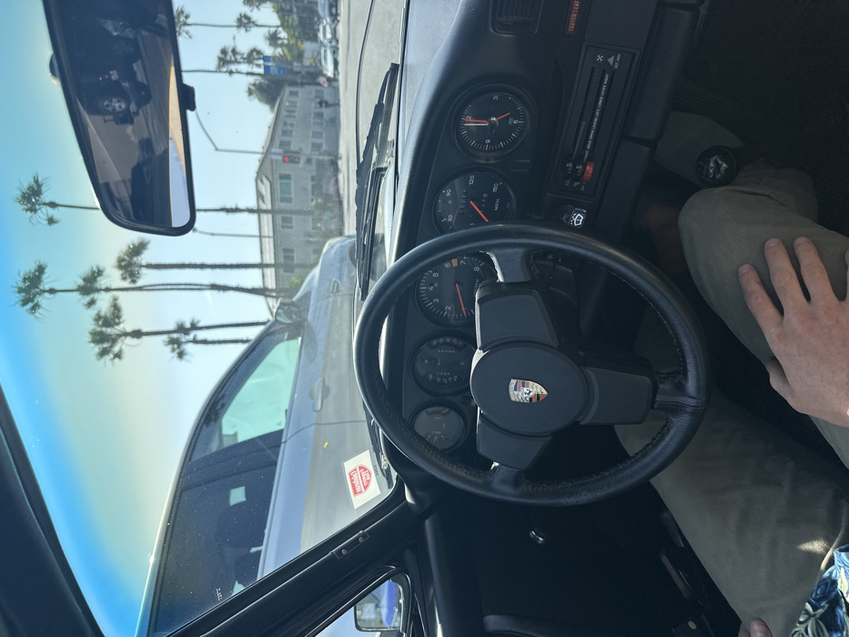 From inside a Porsche, the dashboard is visible, showing gauges and a steering wheel with the Porsche emblem. A person wearing tan pants is also partially visible. Through the windshield, palm trees line a street with buildings and parked cars. The rearview mirror reflects the same outdoor scene. The image is taken at an angle, tilting the objects.