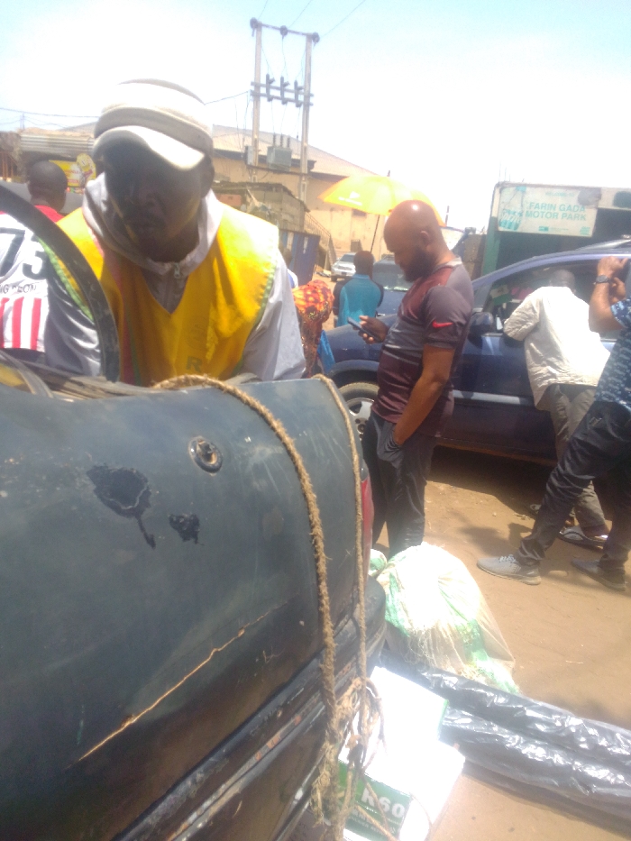 This image depicts an outdoor scene at the Farin Gada Motor Park in Mista Ali, Nigeria, as indicated by a green sign in the background