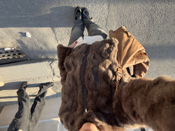The image captures an urban street scene in Paris, France, from a high-angle, downward-facing perspective. The primary subject, positioned centrally, is a person wearing a dark brown zippered fur jacket, a light-colored shirt, dark gray pants, and black leather shoes. A brown leather shoulder bag with brass-colored hardware is slung over their right shoulder. Their left hand, visible with red nail polish, suggests the act of holding a device to take the photograph. To the right of the primary subject, the lower half of a second individual is visible, wearing black pants and dark shoes, standing against a light-colored building wall. The ground transitions from dark asphalt on the left to a light gray concrete sidewalk/curb on the right. A circular metal utility cover bearing the inscription "GAZ" is visible on the asphalt near the primary subject's feet. Numbers, possibly "25 2", are inscribed into the concrete curb. A metal drainage grate is partially visible on the far right of the sidewalk, next to a small piece of white crumpled litter. The scene is illuminated by strong sunlight, casting distinct shadows.