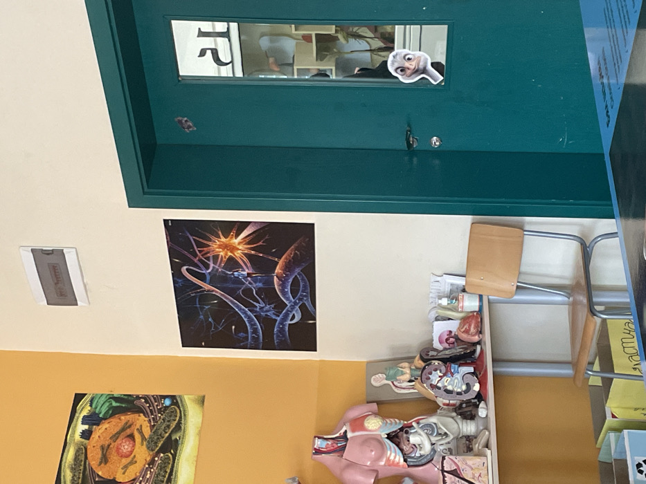 The image displays an interior room, identified as being in Panagyurishte, Bulgaria, likely a classroom or laboratory. The left wall is painted orange-yellow, meeting a cream-colored wall at a corner. On the orange-yellow wall, a poster depicts a detailed biological cell, possibly a plant cell, with various organelles. On the cream wall, another poster features an abstract representation of biological structures, resembling neurons or a neural network, with interconnected tubes and a central bright, star-like formation. A small, indistinct human-like figure is depicted standing on one of the tubular structures. Above this poster, a white, rectangular electrical circuit breaker box is mounted high on the wall. A light-colored table is positioned against the corner. On its surface, several anatomical models are arranged. Dominating the left side is a large, open human torso model, showing internal organs such as lungs, heart, digestive tract, and reproductive organs. To the right of the torso model, smaller anatomical models are visible, including a human brain and a bisected kidney demonstrating internal structure. A framed illustration of internal human anatomy leans against the wall behind these models. Various other small items, including bottles (some containing liquids like hand sanitizer) and papers, are also on the table. A wooden chair with a metal frame is situated next to the table. Partially visible beneath the table are two yellow cardboard boxes, each displaying Cyrillic script. A teal-colored door is on the right side of the frame. It has a silver handle and a lock mechanism. The door features a rectangular window pane. A small, dark, irregular sticker is affixed to the door frame just above the window. A white-outlined sticker of a cartoon ostrich head, facing left, is placed on the lower part of the window pane. Through the window, reflections show elements of an adjacent room or hallway, including what appears to be a sign or whiteboard with discernible Cyrillic characters, specifically "Л" and "Я". Blurred shapes consistent with shelving or cabinetry and some green foliage are also visible in the reflection. A faint, indistinct reflection of a person wearing a light-colored upper garment is present within the window.