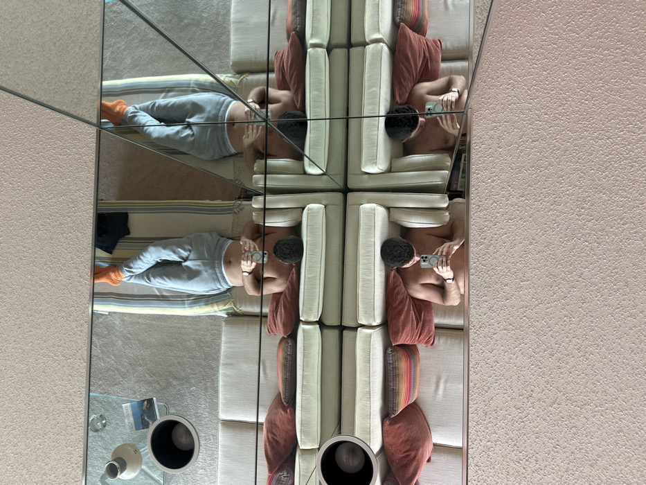 A man lies shirtless on a cream-colored sofa, wearing grey sweatpants and orange socks. He's holding a phone, taking a photo. A glass-topped table with a dark-colored mug and a book sits nearby. The scene is reflected in a multi-paneled mirror ceiling. The mirror distorts the image, creating a symmetrical, almost kaleidoscopic effect. A neutral, textured wall borders the reflection.