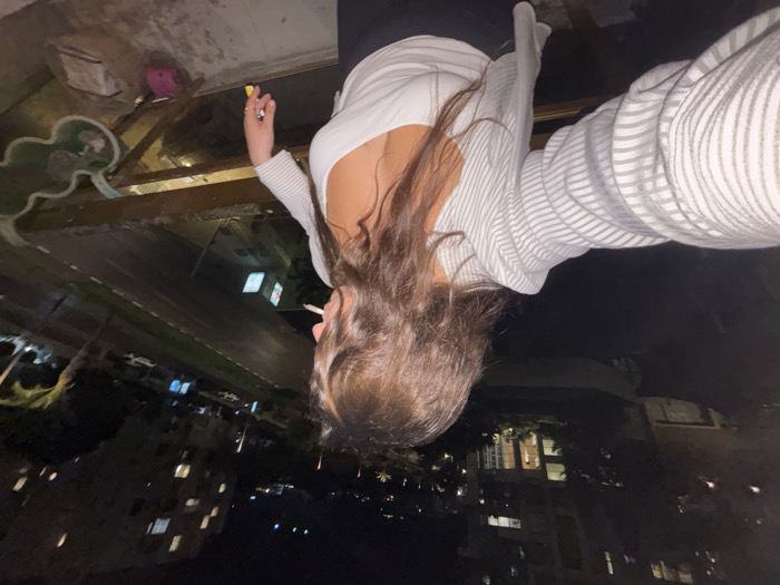 A woman stands on a balcony at night, smoking a cigarette. She wears a white top with a low back and a striped sweater. The city sprawls below, with visible buildings and streetlights. The balcony has a weathered railing and a cluttered surface. The image is rotated.