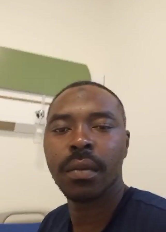 The video begins with a close-up of a man's face. He has dark skin, short hair, and a mustache. He's wearing a dark blue t-shirt. The camera then pans to the right, revealing a hospital room. There is a hospital bed, a bedside table with various items on it, and medical equipment. A man is lying in the bed, facing away from the camera. He appears to be resting. The room is sparsely furnished and painted in light, neutral tones. There is a window with blinds in the background.