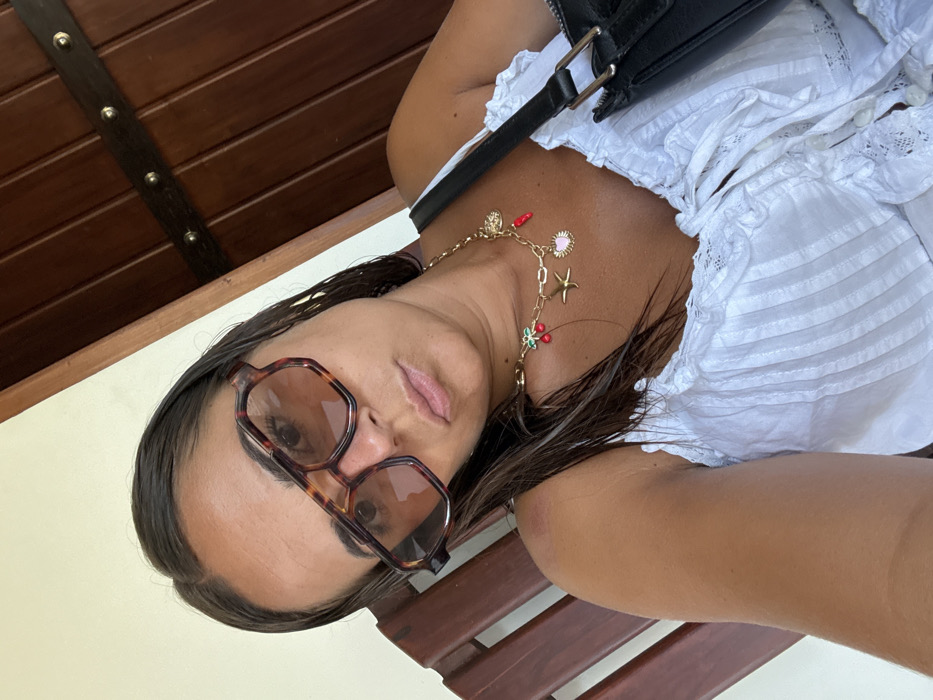 A female individual is depicted in a close-up, seated in Mirissa, Sri Lanka. She has dark, damp hair and a tanned complexion. Her eyes are obscured by oversized, geometric, tortoiseshell-patterned sunglasses with brown lenses. Her expression is neutral with slightly pursed lips. She wears a white sleeveless top with vertical pleats and a tie-front closure. A gold-colored chain necklace with multiple charms, including red cherries, a gold starfish, a pink heart, and a red chili pepper, is visible around her neck. A black shoulder bag rests on her right side. A small, reddish mark is present on her left upper arm/shoulder. The background features a dark brown slatted wooden chair on the left and a dark brown wooden door or wall panel with metallic studs on the right.