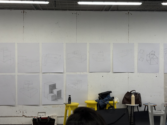 A white wall displays twelve perspective drawings of geometric forms, likely student work
