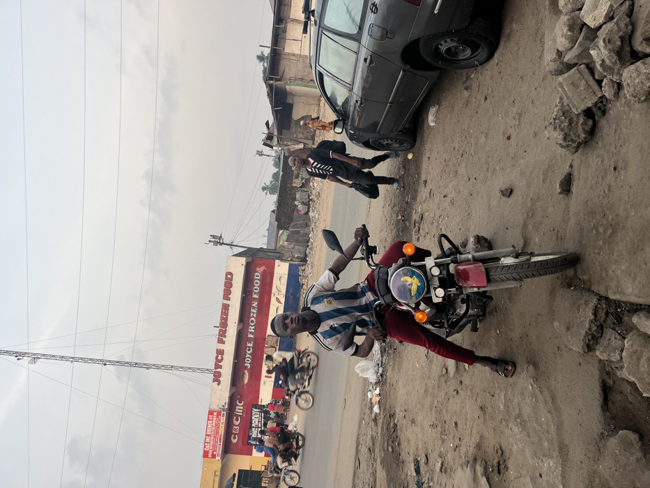 A man in an Argentina soccer jersey sits astride a red motorcycle on a dusty roadside. Next to him is a dark-colored station wagon. Behind him, two people in black are walking away from the camera. In the background, there are people on other motorcycles in front of a building called Joyce Frozen Food. An antenna tower and power lines are visible. The ground near the motorcycle is littered. Rocks are piled on the right side of the image. The sky is overcast.