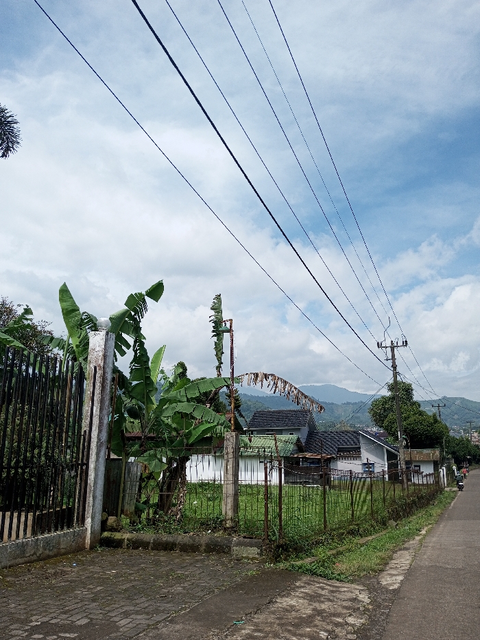 The image displays an outdoor scene in Ariyalai, Sri Lanka, under a partly cloudy sky. The foreground on the left features a paved driveway of interlocking grey pavers, leading to an open dark metal gate with vertical bars, flanked by two light-colored concrete posts. Adjacent to the gate, a grassy, undeveloped plot is enclosed by a low, rusty metal fence. Several banana trees with large green, partially tattered leaves grow within and behind this fence. To the right, a dark asphalt road extends into the midground, subtly inclining uphill. A utility pole with multiple dark horizontal cross-arms stands along the right side of the road, supporting at least five dark electrical or communication lines that traverse diagonally across the sky from upper right to upper left. In the midground, behind the vegetation and fences, several residential structures are visible, primarily featuring dark-tiled roofs. One prominent house displays white exterior walls. The background consists of verdant, undulating hills or mountains beneath a light blue sky with scattered white cumulus clouds. A single, small figure, consistent with a person operating a motorcycle, is distantly visible on the road in the far right midground, moving away from the camera. No other individuals or clear interactions are present.
