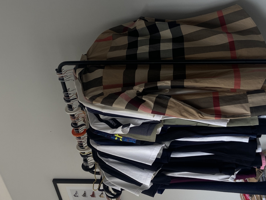 The image displays a black metal garment rack positioned against a light grey wall in Welwyn Hatfield, United Kingdom. The rack is heavily laden with various items of clothing hung on a mix of black, white, pink, and one orange plastic hanger, along with some metal hangers. Clothing items include multiple dark-colored tops, several white t-shirts, one black t-shirt featuring "ARMANI" text, a khaki-colored top, and a prominent tan, black, red, and white plaid long-sleeved shirt on the right side. Partially visible on the wall to the left of the rack is a framed picture with a black border, containing multiple illustrations of different sneakers arranged on a white background. No individuals are present in the scene.