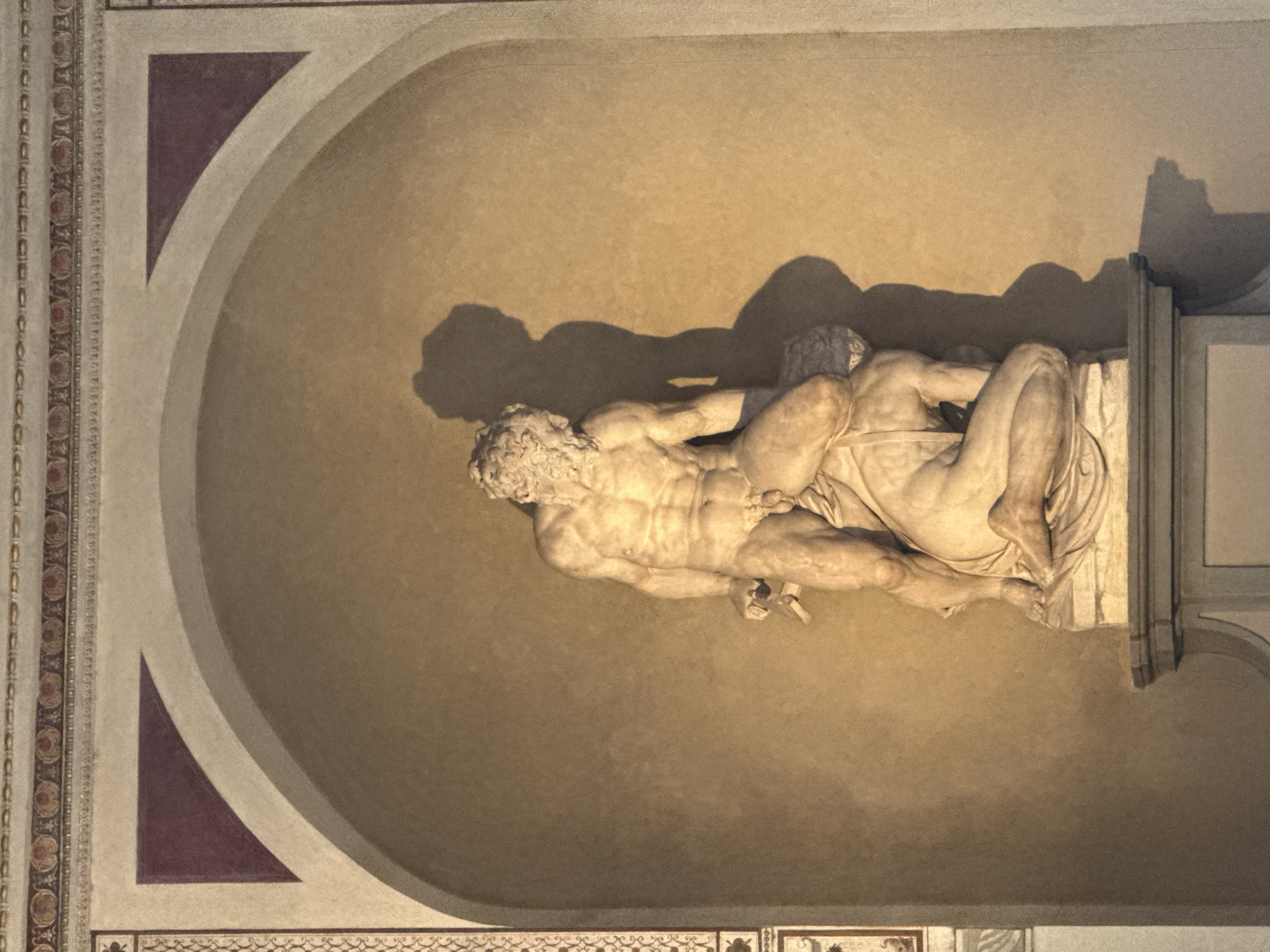 A marble sculpture, identified as Bartolomeo Ammannati's "Hercules and Antaeus," is positioned within an arched niche