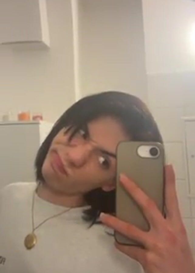 person taking a selfie in a bathroom mirror. The person has dark hair, fair skin, and is wearing a light grey sweatshirt and a gold necklace. They are holding a smartphone in their right hand and making a face at the camera, sticking out their tongue slightly. The background shows a typical bathroom setting with white tiled walls, a white cabinet, and a shelf with various items on it. The lighting is bright and uniform.