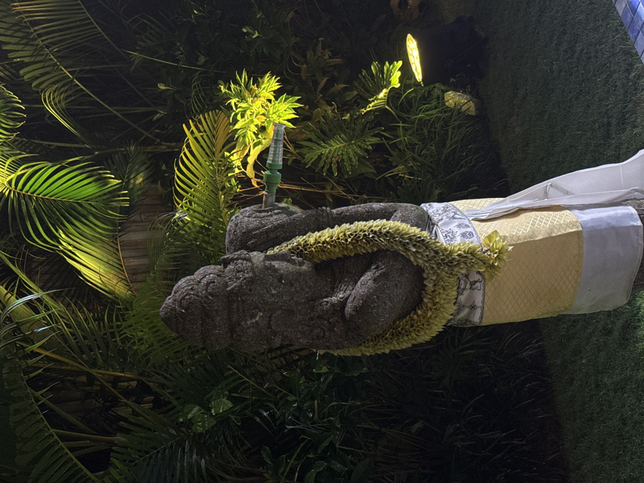 The scene depicts a stone statue in a lush tropical garden at night, located in Munggu, Indonesia