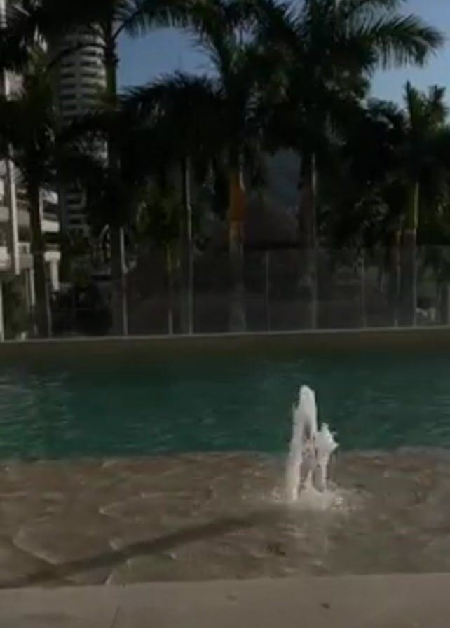swimming pool with a small fountain. Palm trees and high-rise buildings are visible in the background under a clear blue sky. The camera is stationary, focusing on the fountain and the pool. No people are clearly visible, but voices are audible.