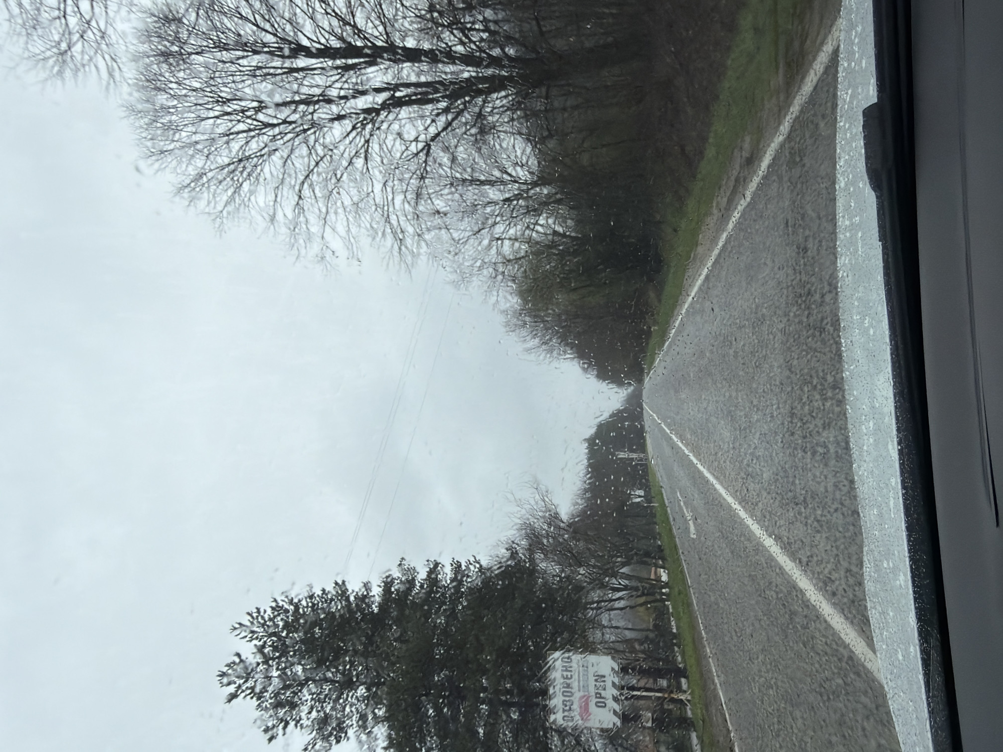 The image depicts a rain-streaked view from inside a vehicle, looking out onto a road. The road is asphalt, divided by a single white line, and flanked by trees on both sides. The trees are mostly bare, suggesting a cold or dormant season. The sky is overcast. A sign near the road reads "OPEN". The location of the image in the city of Debelets, Bulgaria cannot be determined from this image alone. No people are visible in the image.