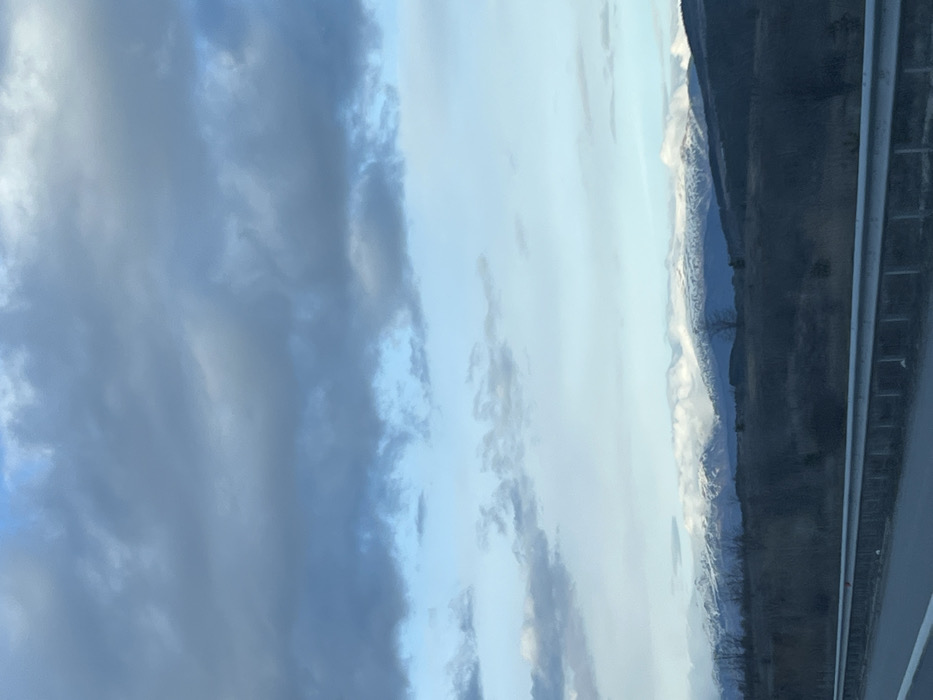 The image displays a landscape scene, positioned from an apparent roadside perspective, in the city of Dyakovo, Bulgaria. In the foreground, a dark grey, multi-barred metal guardrail extends horizontally across the lower frame, with a sliver of dark asphalt road visible beneath it on the left. The midground consists of a wide expanse of dry, dark brown and grey vegetation, interspersed with several bare, deciduous trees. In the background, a distinct mountain range stretches across the horizon, its peaks partially covered with white snow. Patches of white clouds cling to the snowy mountain tops. The sky occupies the upper two-thirds of the frame, transitioning from a lighter blue just above the mountains to a predominantly overcast dark grey with layered cloud formations in the uppermost section. No individuals, animals, or active subjects are visible.