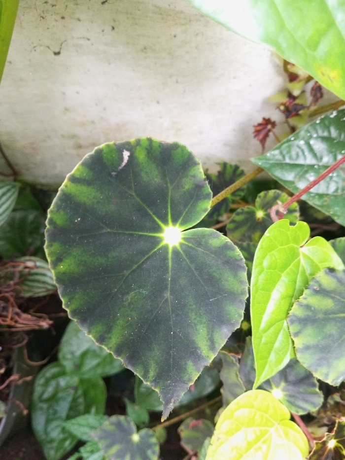 The scene depicts a close-up of various plant foliage positioned against an off-white, textured background, consistent with a wall or concrete surface, in Mindat, Myanmar. A large, heart-shaped leaf with dark green and lighter green striped patterns radiating from a bright central point occupies the foreground. A small, irregular white deposit is present on the upper-left edge of this prominent leaf. Surrounding this leaf are additional plant elements: darker green leaves with indistinct patterns to the left and below, and brighter, lime-green leaves to the right, one displaying a small tear. Thin, reddish-brown stems and developing reddish-brown leaf buds are visible among the foliage, particularly in the upper-right section. No individuals, animals, or artificial objects apart from the background structure are present.