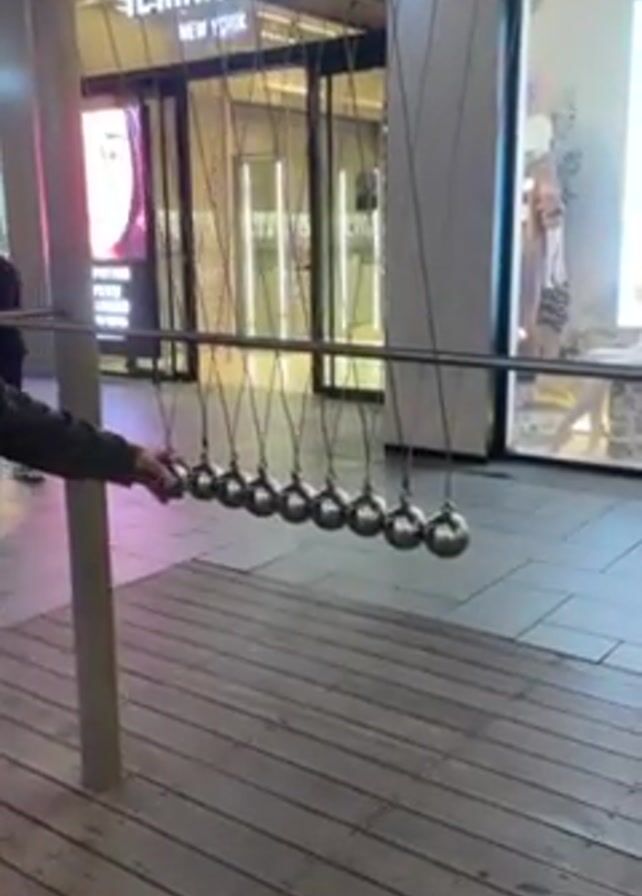The video depicts a Newton's cradle set in motion in an outdoor shopping area