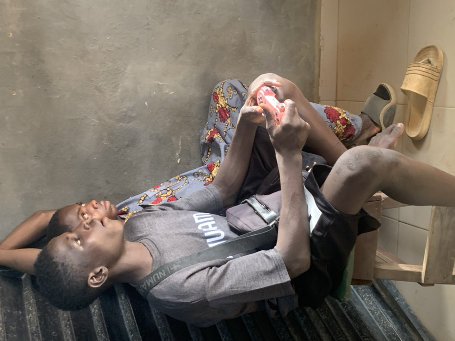 Two people are relaxing, with one reclining on the other. The person on top, wearing a gray t-shirt and dark shorts, plays a handheld video game. A small shoulder bag hangs across their body. The bottom person wears patterned clothing. Two pairs of sandals sit near their feet. They are lying on a metallic gridded surface against a concrete wall.