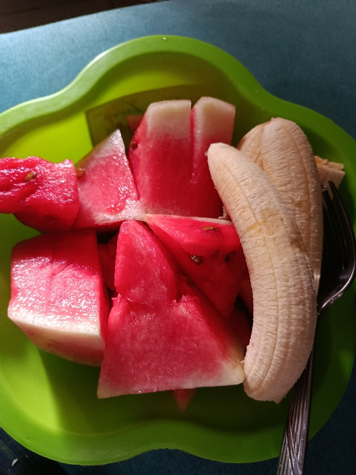 The scene depicts a close-up, high-angle view of a meal or snack presented on a green, irregularly shaped plate. The plate contains numerous cut pieces of watermelon, exhibiting vibrant red flesh, sporadic dark seeds, and white rind. Adjacent to the watermelon pieces on the right side of the plate are two peeled bananas, light yellow in color. A silver-toned fork with a textured handle is partially visible, resting within the plate on the bottom right. The plate itself is bright lime-green. The background consists of a dark teal surface, likely a table or countertop. There are no individuals present. The location is Unknown, Unknown.