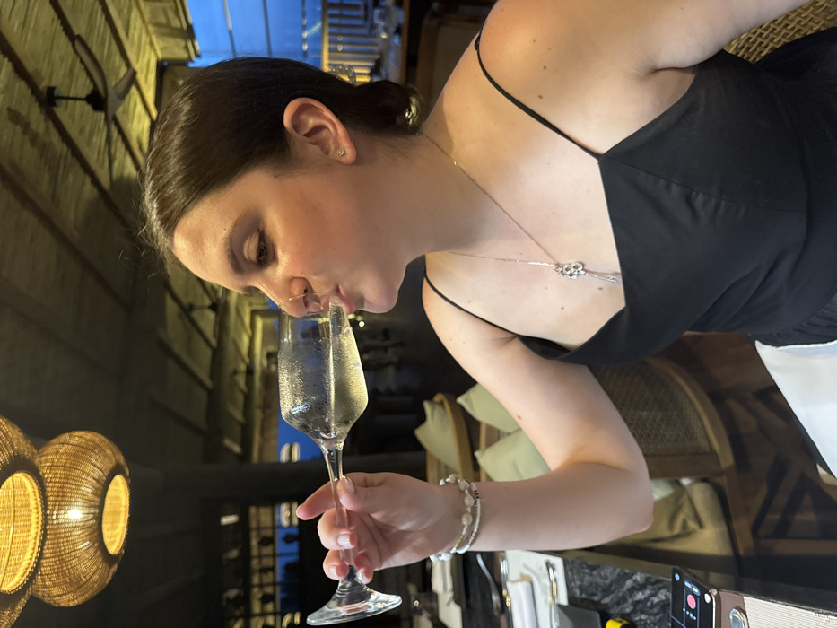 - "A woman with dark hair and fair skin, wearing a black dress with thin straps and a silver necklace, holds a champagne glass up to her nose, appearing to smell its contents" by FM-8gHP13, licensed under CC BY 4.0