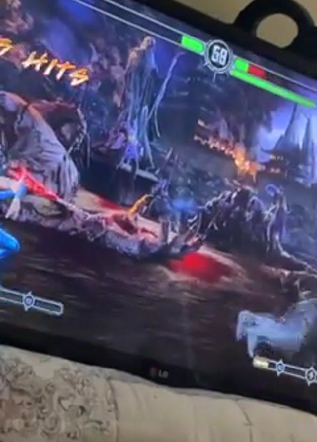 A low-angle shot shows a person playing a video game on an LG television. The game appears to be Mortal Kombat, and one of the characters is Kitana, dressed in blue. She is facing off against another character in a dark and detailed environment. The game interface is visible, showing health bars and damage percentages. The television is resting on a patterned blanket.