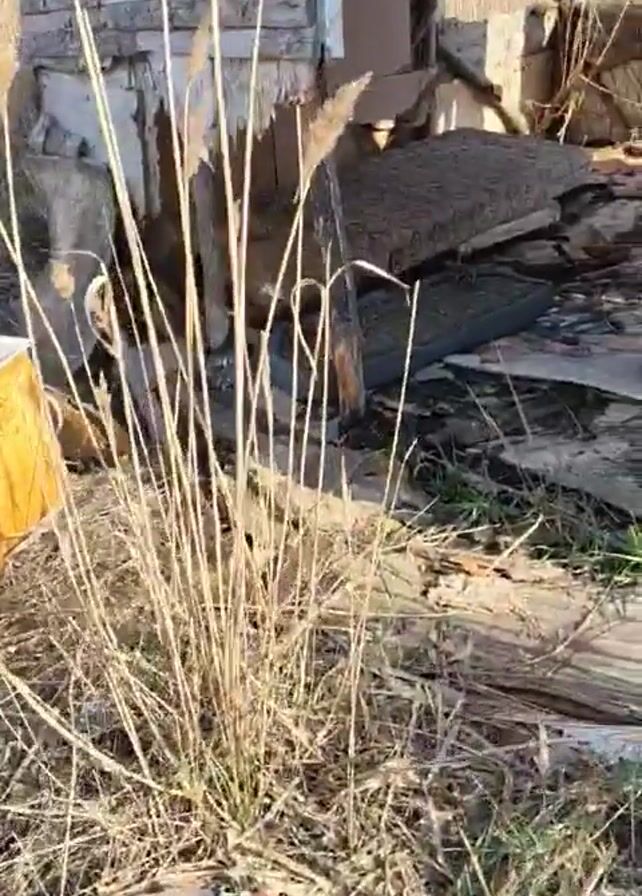 person walking through tall, dry grass with scattered litter. They then approach a dilapidated wooden structure. The interior of the structure is visible, revealing a room with broken walls, debris strewn across the floor, and a torn mattress. The room appears abandoned and in a state of disrepair. The outdoors is visible through the structure's openings.