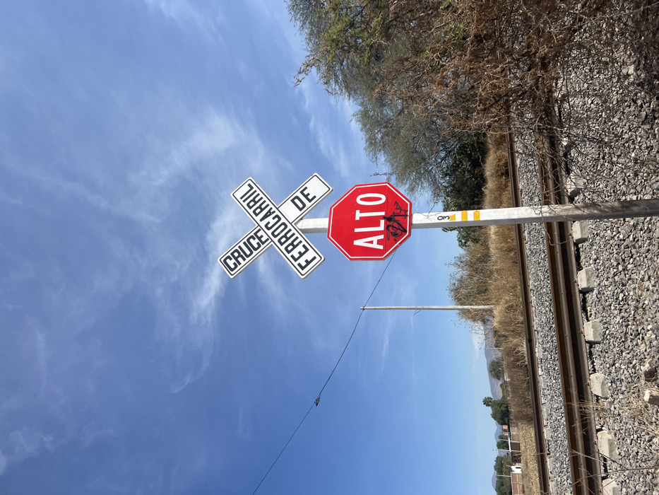 A railroad crossing in Mexico is shown with a blue sky background