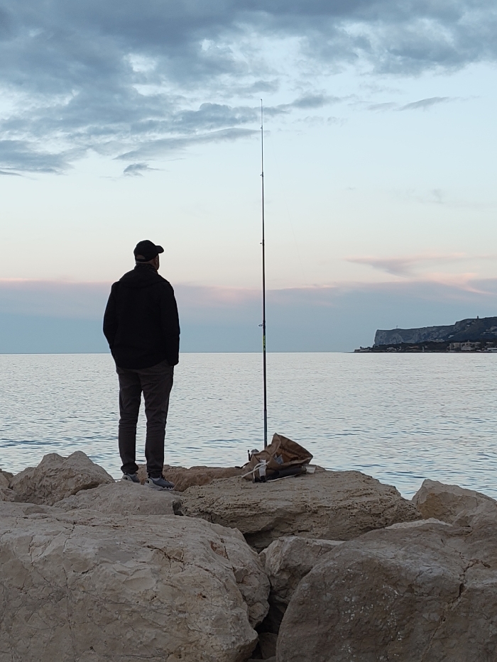 A lone male individual is positioned on a rocky breakwater in Dénia, Spain