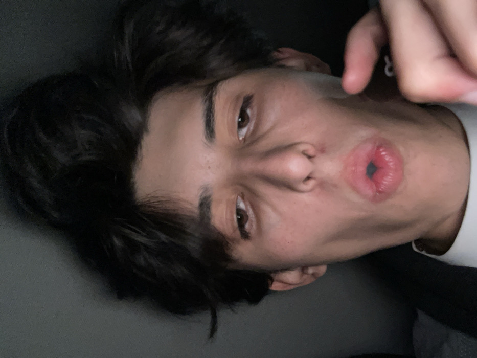 A young man with dark hair and eyes lies on his side, looking at the camera. His lips are pursed into a small, puckered circle. He appears to be on a dark grey surface. A finger and white shirt can be seen in the top right of the image.