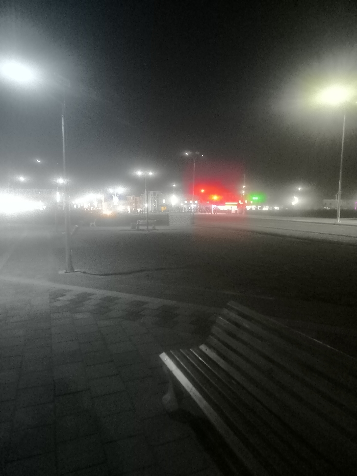 The scene depicts a foggy or hazy urban environment at night in Pakhtakor, Uzbekistan. A dark, featureless sky dominates the upper portion. In the immediate foreground, to the lower right, the slatted wooden back and seat of a park bench are partially visible, angled towards the right. The ground directly in front of the bench and extending to the left consists of a paved surface made of rectangular paver stones. Multiple streetlights on tall poles illuminate the area with bright white, diffused light, indicating a significant atmospheric haze or fog that blurs their outlines and spreads their luminescence. These streetlights line what appears to be a main thoroughfare. Further down the road, approximately in the center-right of the frame, a prominent red traffic signal is active, accompanied by a smaller green light to its right, suggesting an intersection. Beyond these signals, through the heavy atmospheric conditions, indistinct building structures or commercial establishments with various internal and external illuminations are vaguely discernible. No individuals, vehicles, or discernible activities are observed within the frame. The overall impression is one of a deserted urban street at night with limited visibility due to weather conditions.