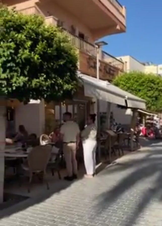 street scene with outdoor dining at several restaurants. People are seated at tables, and servers are attending to them. The street is paved with gray bricks and is lined with buildings on one side. A pharmacy sign is visible in the background. The sky is blue, and the sun casts shadows on the street. A few trees are situated along the street.
